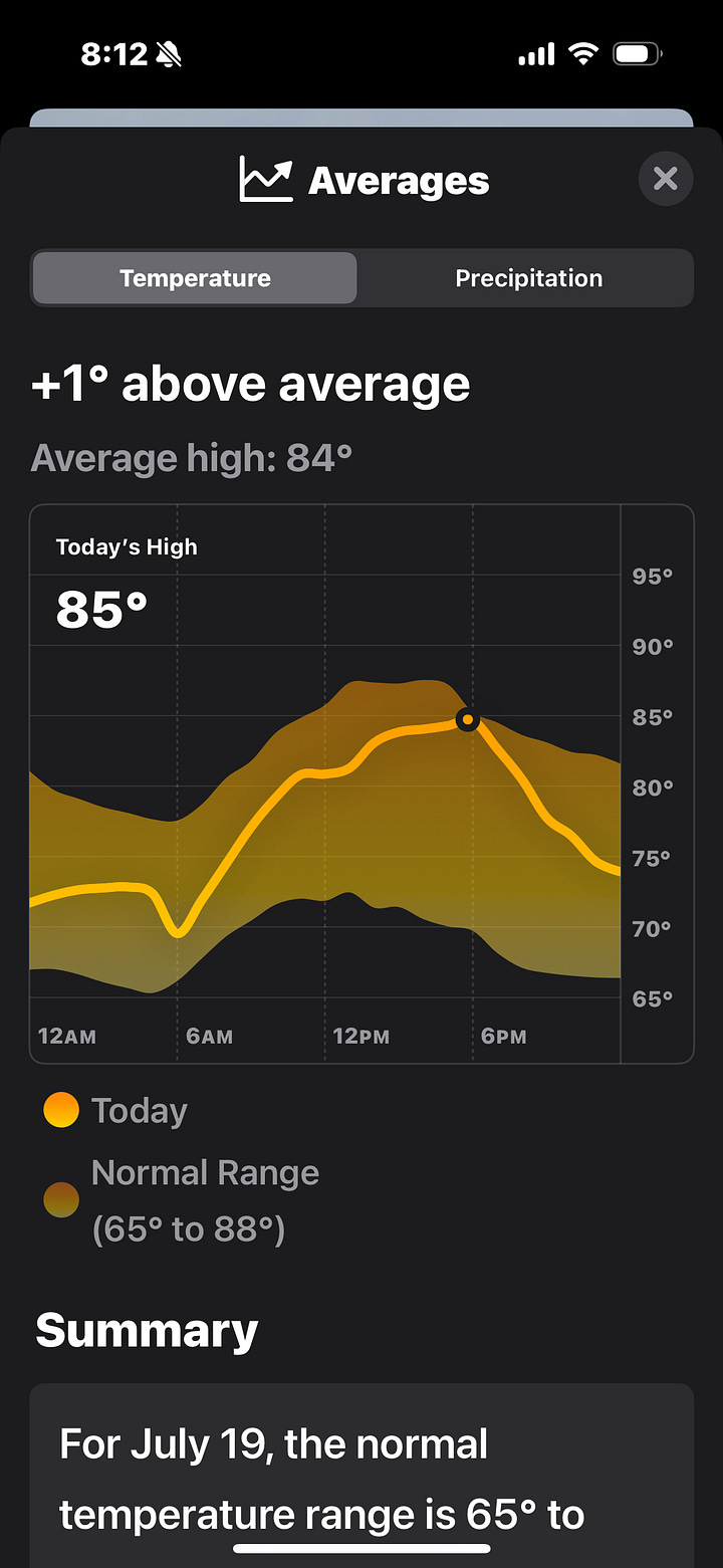 Pulling an average of a number higher, meanwhile, hides the drama in the extremes of the distribution. A heat wave in the 100’s, for example, could be 10-20 degrees warmer than the historical average for a given day even if the global year-round average is only up a couple of degrees. You can even see this day-to-day on your phone by clicking on the long-term average screen. Groups like Climate Central also have helpful tools where you can see global charts on each day’s difference from history.